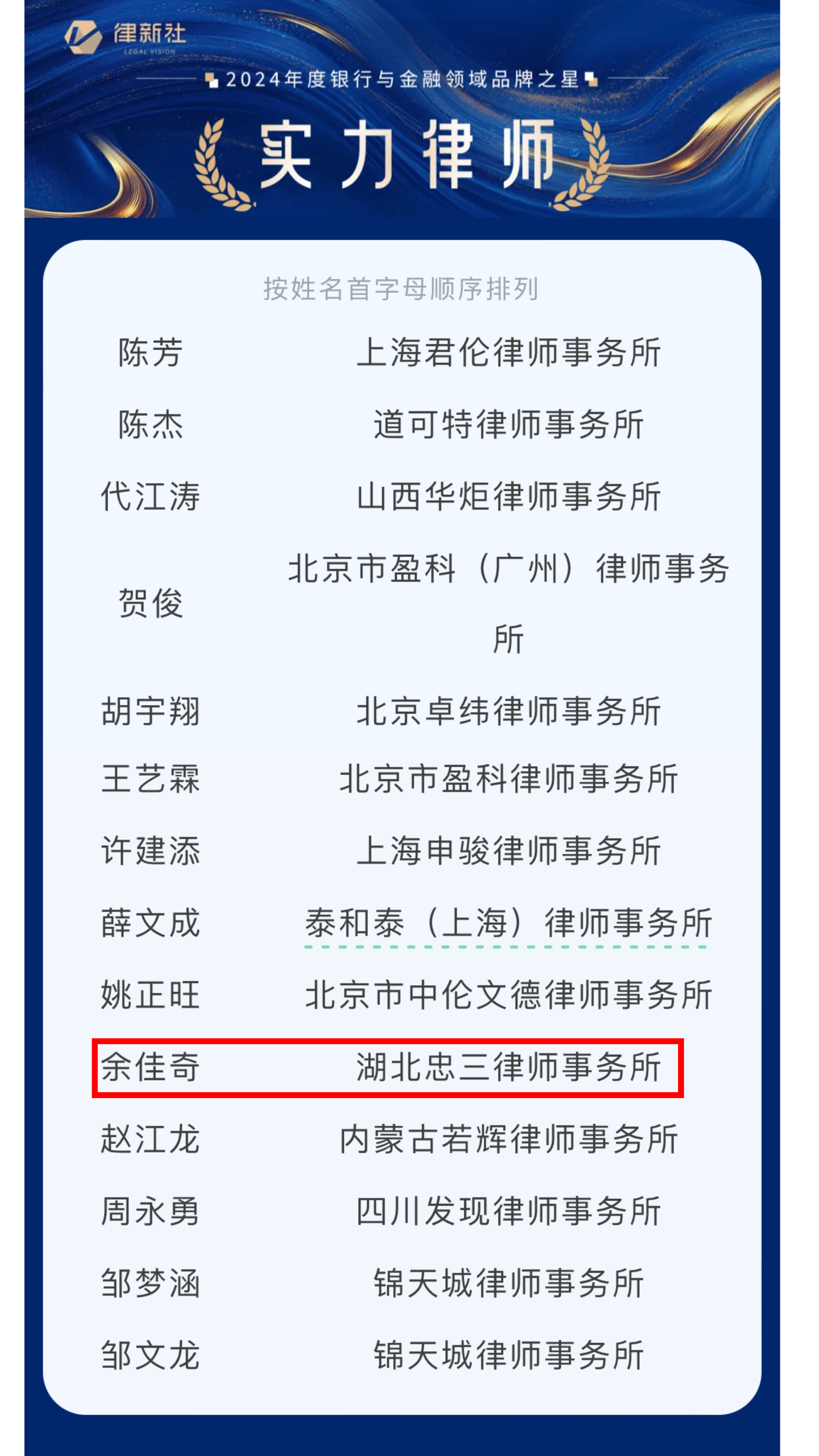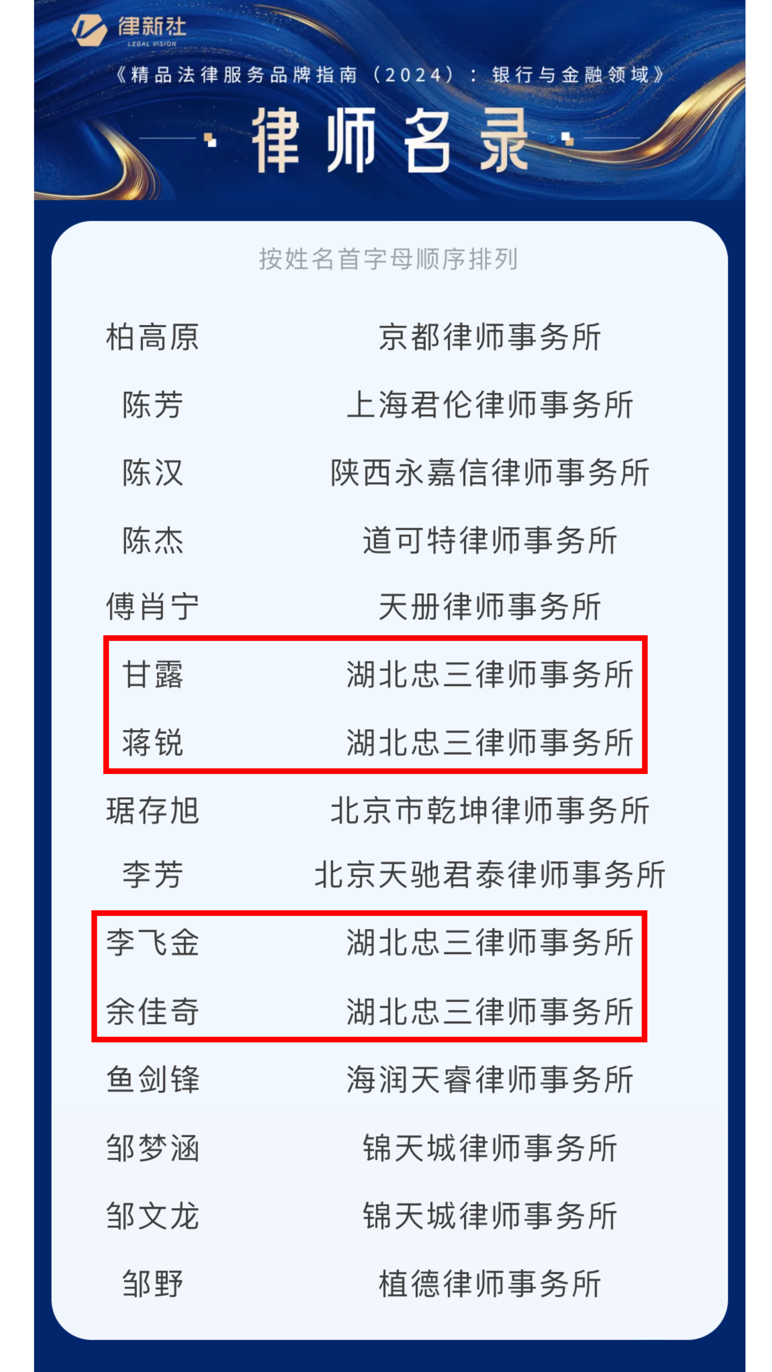 此次入选律新社《精品法律服务品牌指南(2024):银行与金融领域》,是业界对忠三所在银行和金融业务上法律服务能力的肯定。未来,忠三所将继续加强在银行与金融领域的业务拓展和团队建设,不断提升自身的专业能力和服务水平,精深理解法律法规,紧跟监管政策并作出前瞻性判断,成为金融横流中的驭舟蹈浪之人。