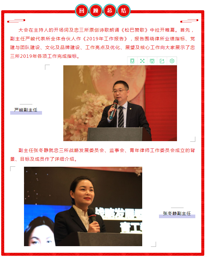 1月11日-12日,忠三所2019年全体合伙人大会在天屿湖假日酒店圆满举行。会议表决通过成立忠三所战略发展委员会、监事会、青年律师工作委员会、增选张冬静为所副主任、成立七大专业中心,审议通过《党政联席会议制度及议事规则》、《金融(资本市场)业务合作指引》、《法律服务投标工作指引》等事项。上述事项的通过,标志着忠三所管理体系逐步规范,制度建设日臻完善。