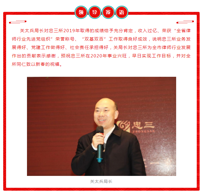 1月13日下午,忠三所迎来了大家庭的欢聚,2019年总结表彰大会在湖锦酒楼国宴厅隆重举行,武汉市司法局党委书记、局长关太兵、律工处处长刘远雄、副处长樊静、武汉市律师协会秘书长田长喜、原武汉市司法局巡视员、原武汉市律师协会会长杨维林莅临会场与全体同仁一起共襄盛会。