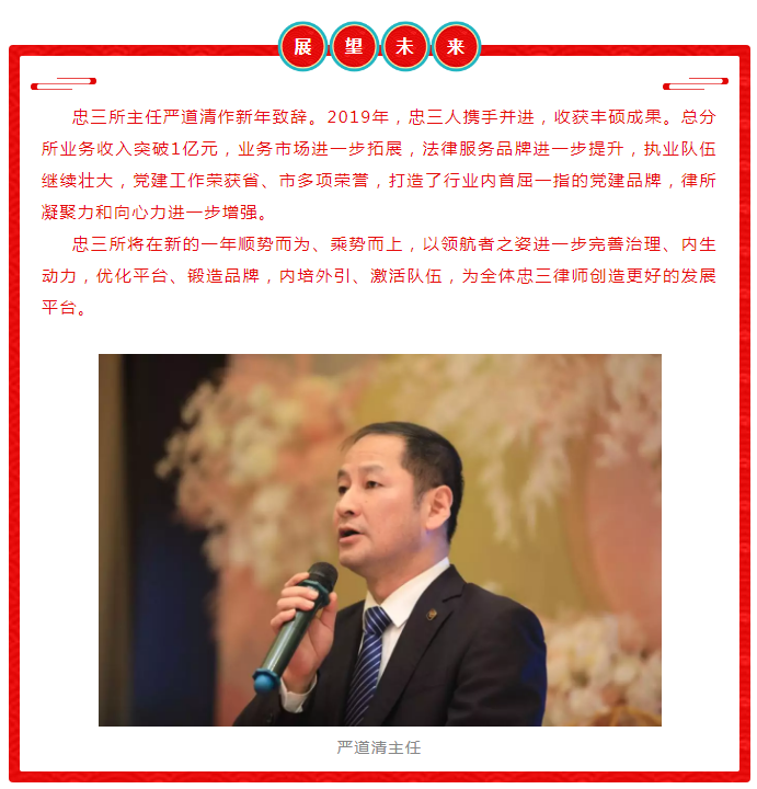 2019年既是建国七十周年,也是律师制度恢复四十周年,感恩时代的机遇,忠三历经近二十年的探索与发展,即将迈入发展的关键时期,忠三人已经作好继往开来、谱写新篇的准备。