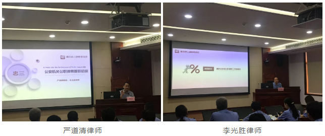 仪式结束后,严道清律师、李光胜律师前往市公安局四楼法制支队会议室,为全市公安系统50余名公职律师开展——公安机关公职律师履职专项法律培训。