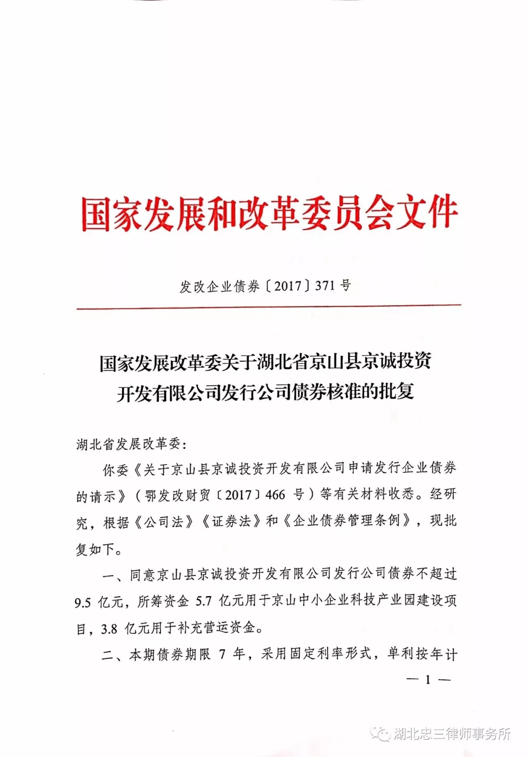 2017年12月29日,国家发展改革委向湖北省发展改革委下发《国家发展改革委关于京山京诚投资开发有限公司发行公司债券核准的批复》(发改企业债券〔2017〕371号),核准了发行人京山京诚投资开发有限公司申请发行2018年公司债券项目。