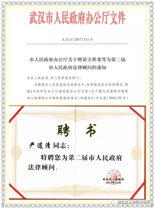 湖北忠三律师事务所主任、武汉市律师协会会长严道清律师连续受聘担任第一届、第二届市人民政府法律顾问。其受聘期间,充分发挥专业特长和职业优势,积极、认真履职,与市政府法律顾问团成员一起,群策群力,共同促进建设法治政府、法治武汉。
