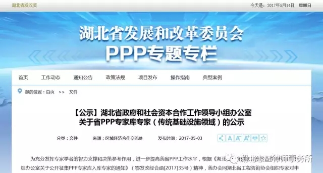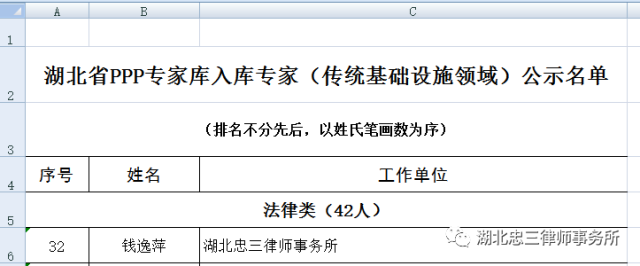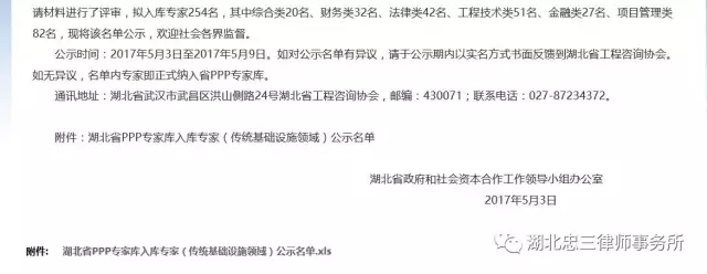 2017年5月3日,湖北省发改委官网PPP专栏发布“湖北省政府和社会资本合作工作领导小组办公室关于省PPP专家库专家(传统基础设施领域)的公示”的公告,湖北省忠三律师事务所高级合伙人钱逸萍律师凭借其扎实的法律专业功底和丰富的PPP项目实践经验,成功入选该专家库。