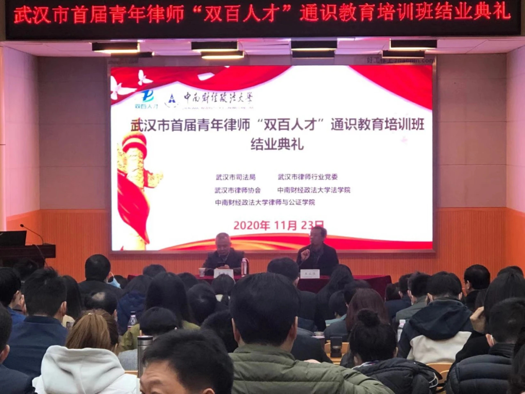 2020年11月19日至23日,为进一步落实党的十九大精神,迎接“十四五”发展挑战,在市委市政府的统一部署安排下,武汉市司法局、武汉市律师行业党委、武汉市律师协会与中南财经政法大学共同主办了武汉市首届青年律师“双百人才”通识教育培训班。