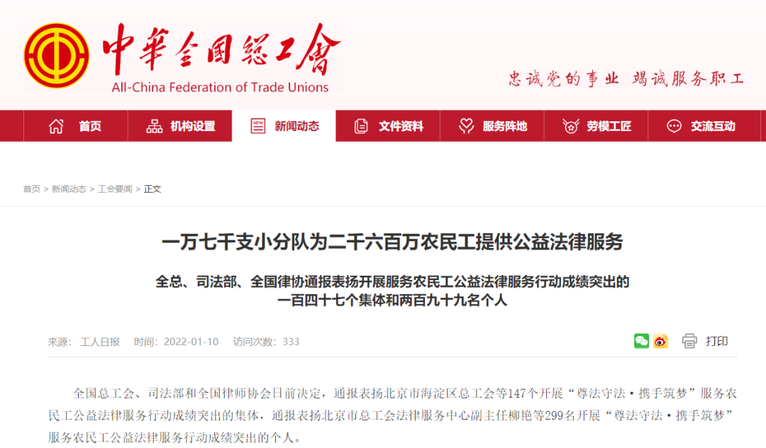 近日,中华全国总工会、司法部和中华全国律师协会对2017-2020年开展 “尊法守法·携手筑梦”服务农民工公益法律服务行动成绩突出的147个集体和299名个人予以通报表扬。经湖北省司法厅和湖北省律师协会共同推荐,湖北忠三(黄石)律师事务所成为湖北省内唯一被表彰的律师事务所。