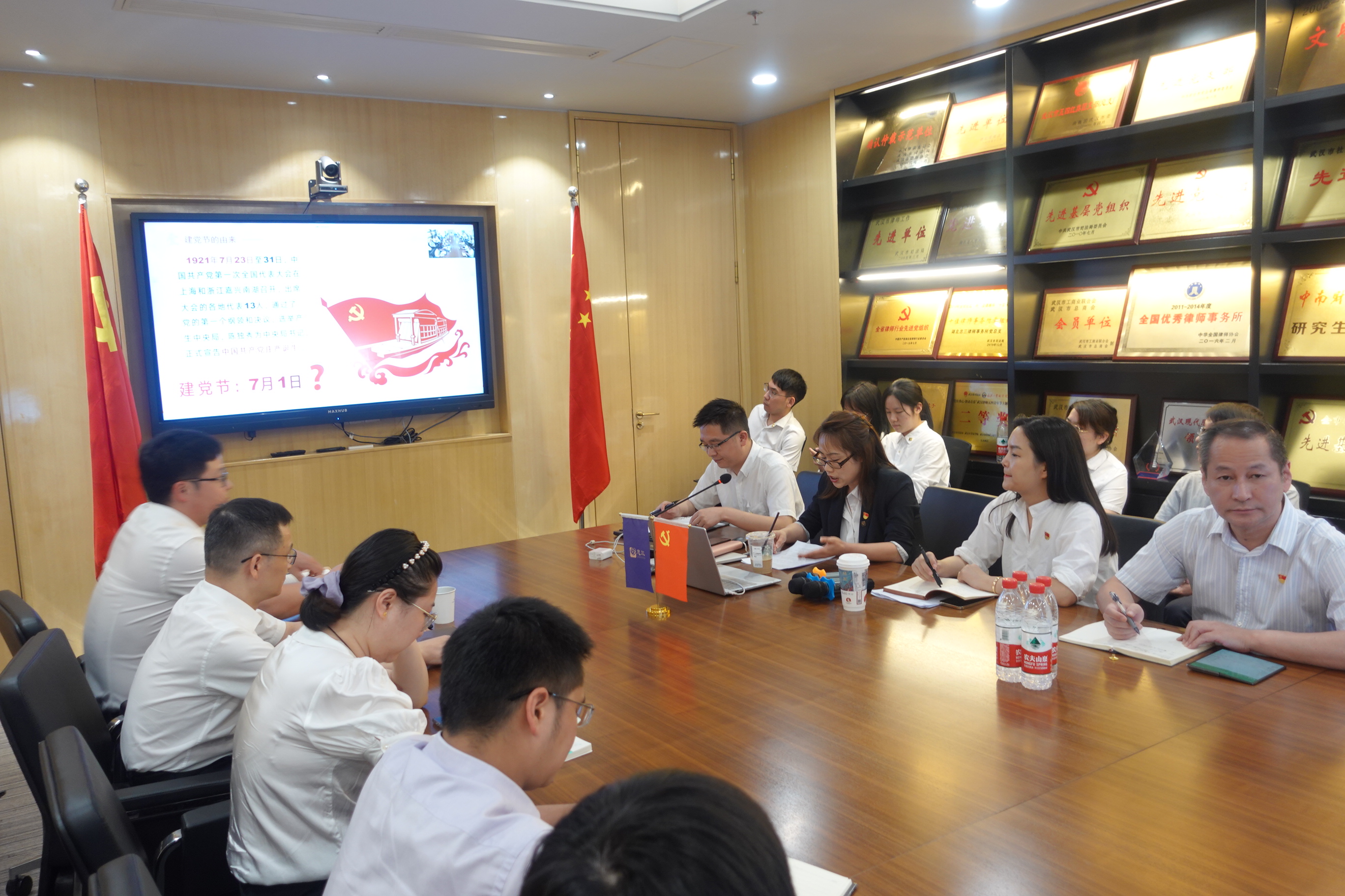 忠三党总支副书记、一般合伙人吴思梦律师介绍了建党节的由来,她提到了五个“一”:第一个“一”是第一篇纪念党生日的文章——1936年,党的一大代表陈潭秋撰写的《第一次代表大会的回忆》,被史学界公认为最早回忆并公开发表的有关中共一大内情的重要文献,有极高的史料价值;第二个“一”是第一次在7月1日作党员教育专题报告——1937年7月1日,中共中央在延安召开党的活动分子大会,周恩来作了《十六周年的中国共产党》专题报告;第三个“一”是第一次明确党的纪念日——1938年5月26日至6月3日,毛泽东在延安抗日战争研究会发表演讲,即《论持久战》中提出“今年7月1日,是中国共产党建立的17周年纪念日。”;第四个“一”是第一次开展纪念党的生日活动——1938年6月14日,中共陕甘宁边区委员会宣传部和边区抗敌后援会,召开延安党政军、各机关团体代表第一次联席会议,决定于7月1日举行延安各界庆祝中国共产党成立17周年纪念大会;第五个“一”是第一次出版建党纪念特辑——1941年7月1日,《解放日报》编辑出版了“中国共产党二十周年纪念特辑”,发表了一篇社论和朱德、林伯渠、吴玉章写的三篇纪念文章。