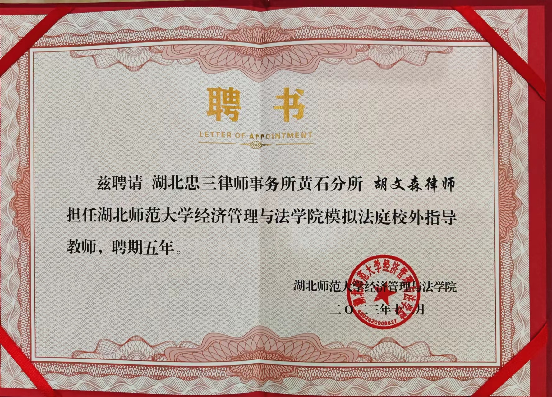 胡文森律师、陈泽伟律师利用休息时间,为此次模拟法庭活动认真筹划,精心指导,被聘为湖北师范大学经济管理与法学院模拟法庭校外指导教师。