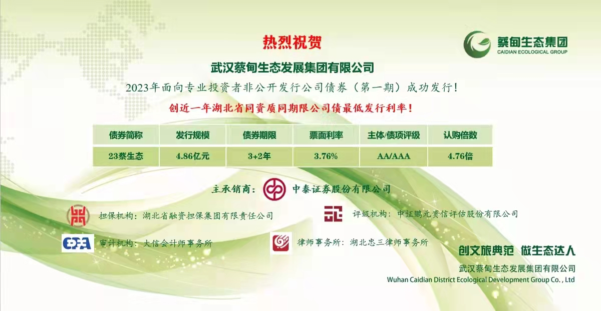 2023年12月12日,武汉蔡甸生态发展集团有限公司2023年面向专业投资者非公开发行公司债券 (第一期)成功发行。此次发行规模4.86亿元,票面利率3.76%,创下近一年湖北省同资质同期限公司债最低发行利率。