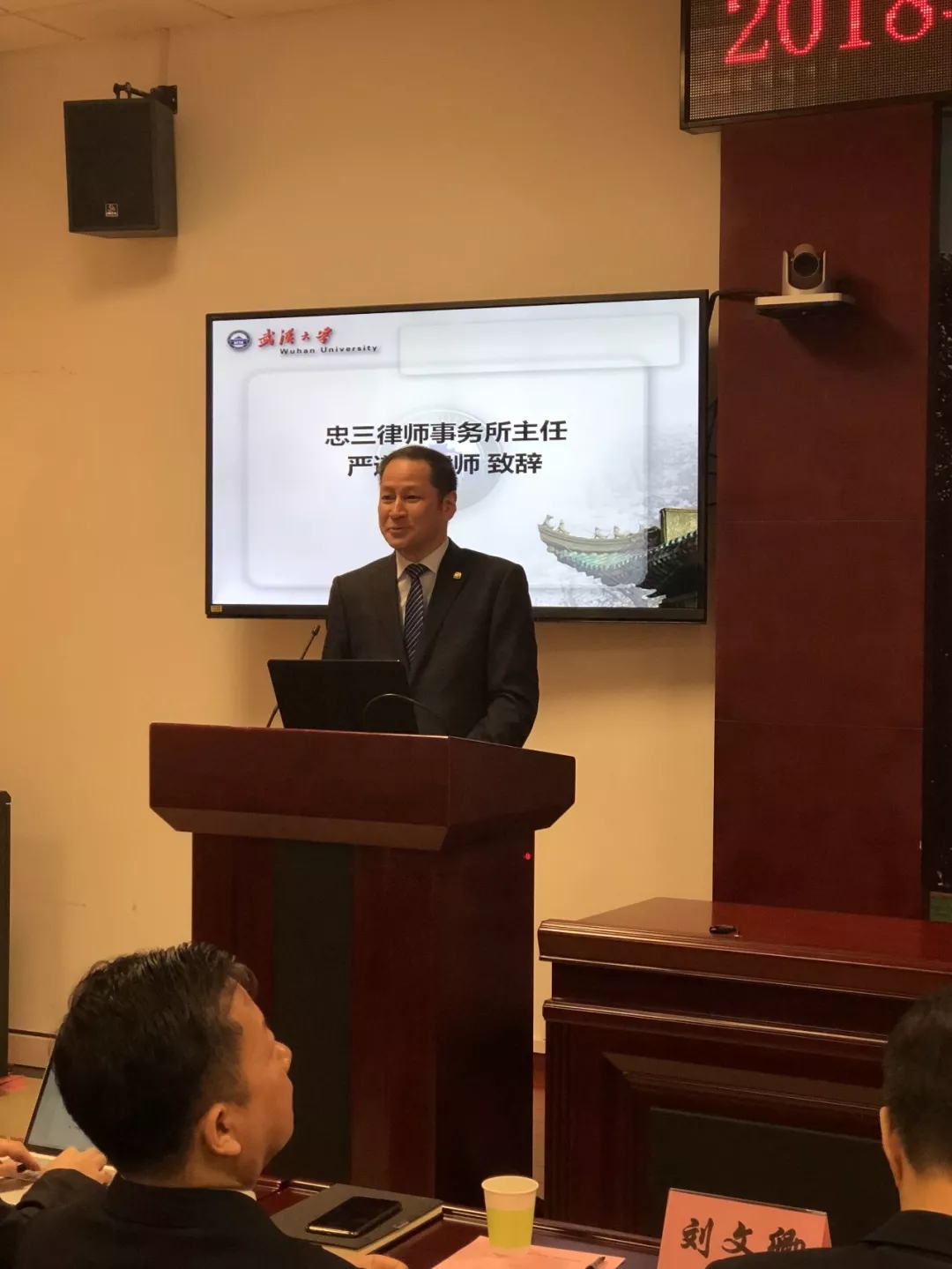 严道清主任代表忠三所全体律师发言,他表示,忠三所会始终坚持“忠三励志奖学金”,他用 “武大情结”和“忠三情结”说明了设立奖学金的初心,就是为了支持武汉大学法学院的建设、支持法律精英学子的成长、构建忠三一家人的良好氛围。