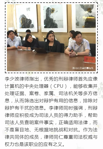 李少波律师结合他执业十多年来办理刑事案件的心得体会,从“有效辩护的法律职业定位”、“诉讼各阶段的有效辩护设计”、“各方信息与权力博弈中的律师定位”、“作为司法人员得力助手的有效辩护”、“作为法律逻辑的有效辩护”、“有效辩护中律师应具备的心理素质”等六大方面向大家全面介绍了律师在刑事案件中如何真正践行有效辩护。
