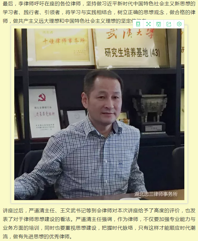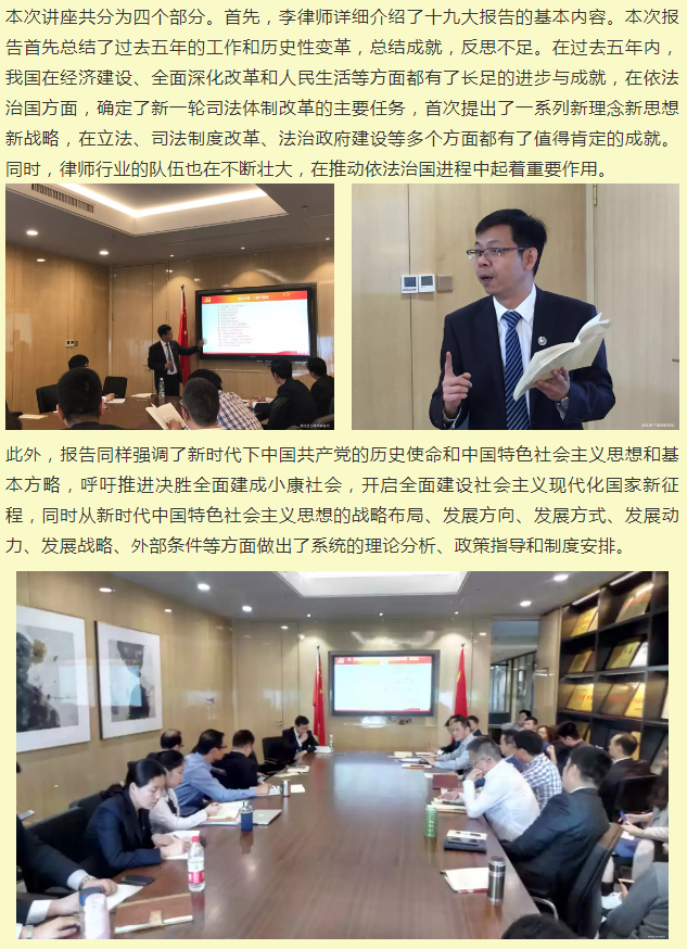 3月30日下午,“忠三法律大讲堂”第三期在我所会议室隆重开讲。忠三所高级合伙人李少波律师为全所律师带来了一场主题为“做习近平新时代中国特色社会主义新思想的学习者、践行者、引领者——党员律师解读十九大报告”的专题讲座,为各位党员、非党员律师详细介绍了十九大报告的主要内容,深刻解读了报告的内涵与思想。忠三所主任严道清律师、书记王文武律师等各位高级合伙人律师均到会一同聆听,并发表了自己的看法。