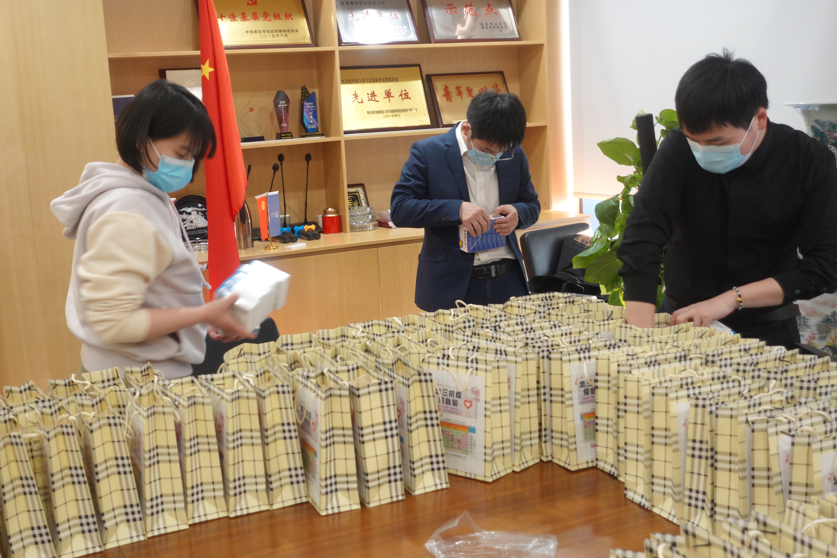忠三本着“安全至上、生命至上”的原则,把疫情常态化防控作为律所经营的前提和基础,准备医用口罩、消毒剂、酒精、红外线测温仪、手套、防护服等物资,满足日常防疫需要。在当前医疗资源紧缺的情况下,为让防疫工作有温度更有力度,忠三管委会采购包含连花清瘟颗粒、强力感冒片、西瓜霜含片、抗原检测试剂盒等抗疫药品的180份“忠三抗疫爱心包”发放给全所员工。这一份份凝聚着爱心的礼包,让大家在寒冬里倍感忠三一家人的温暖。