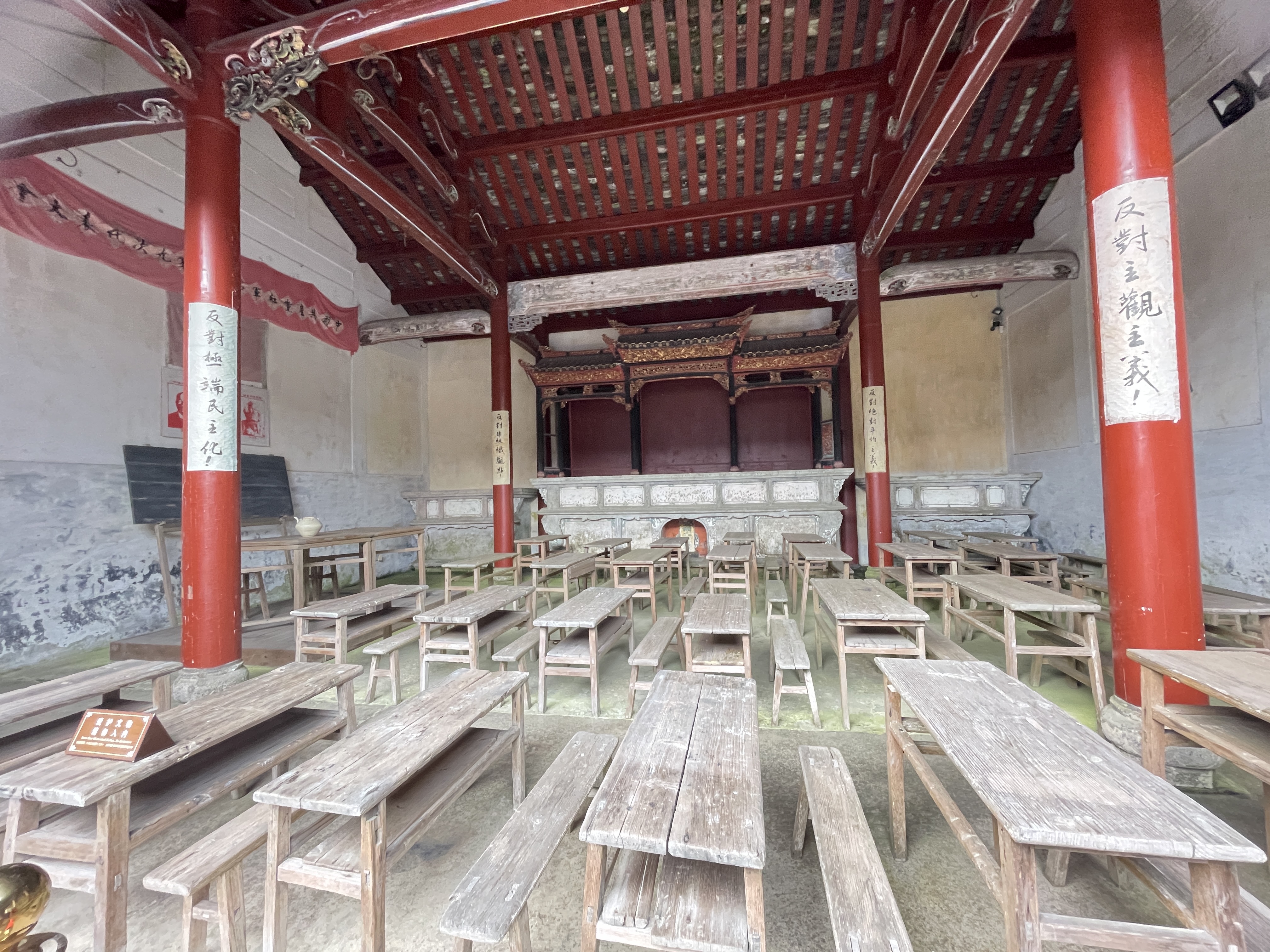 来到93年前召开古田会议的现场:一张简易的桌子就是一方讲台,一块简陋的小黑板,墙上挂着马克思和列宁的画像,台下是一排排旧桌椅。这儿便是上杭县古田镇原廖家万元祠堂——1929年在这里召开了中国共产党红四军第九次代表大会,暨著名的古田会议。会场中间的柱子上还贴着的标语、毛泽东同志当年批改文件的桌子、地上的炭黑色印记……这些革命文物作为历史的见证者,向人们讲述着那个烽火年代红军战士的艰苦生活及顽强斗争、不屈不挠的精神,正是他们用自己的青春和热血换来了我们今天这美好的生活。