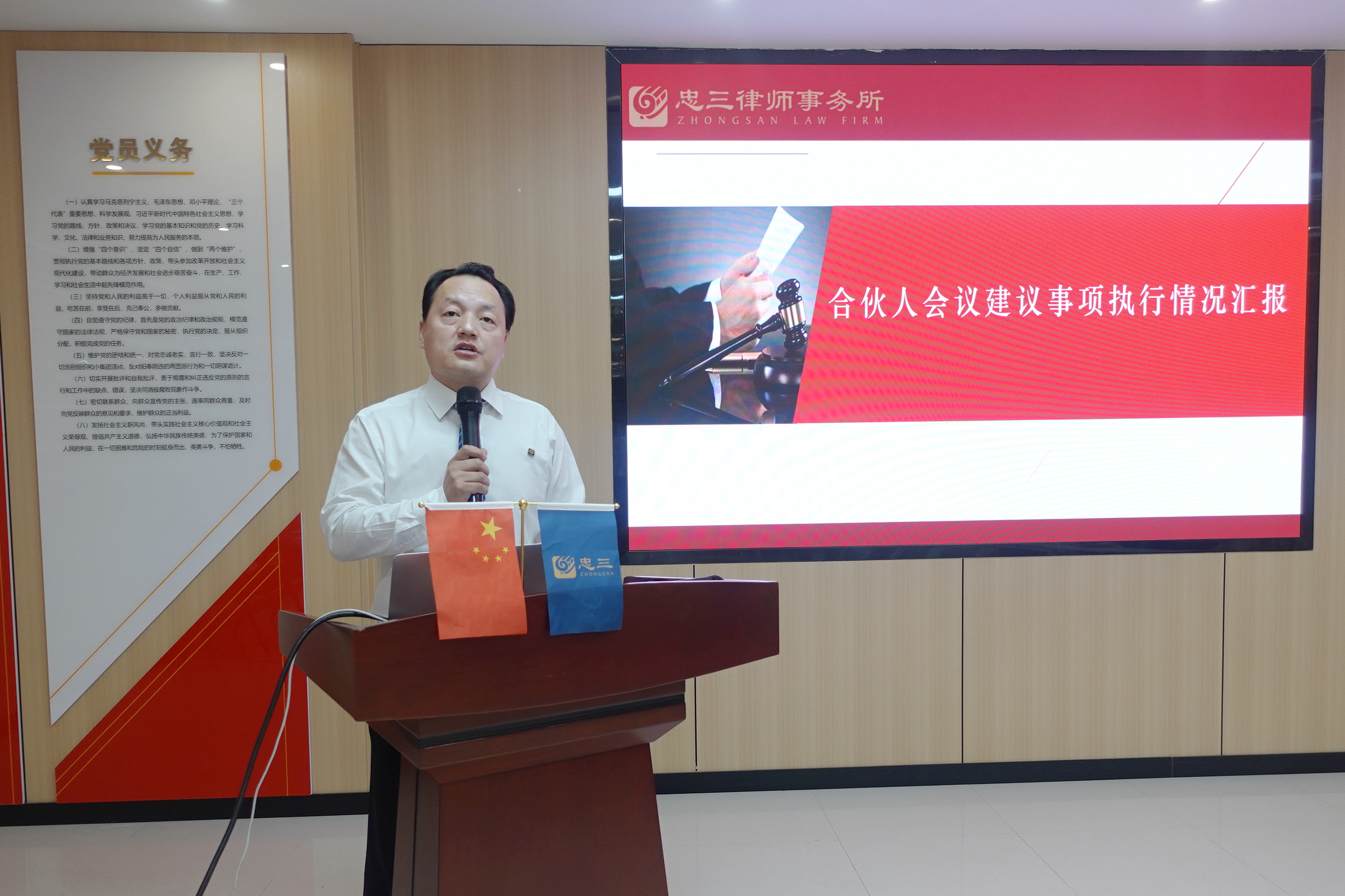 会议第一项是由忠三战略发展委员会主任杨勇律师对忠三战略地图的完成情况进行汇报,分别从收入、规模、办公面积、党建等方面进行数据对比分析;并针对完成情况对战略地图四个层面即财务层面、客户层面、内部流程层面、学习和成长层面提出诸多实质性的建议。