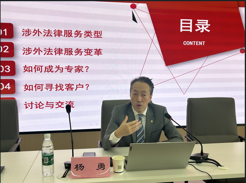 讲座中,杨勇主任以“涉外法律实务交流”为主题,结合自己多年的涉外执业经历,围绕涉外法律服务类型、涉外法律服务变革、如何成为专家、如何寻找客户四大方面,着重讲解了涉外案件实务和跨境案件实务。此次培训课程理论与实践结合紧密,具有较强的理论指导性和实践操作性,受到参会律师的好评。
