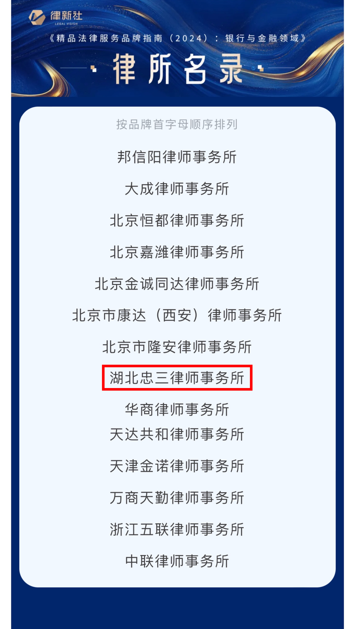 此次入选律新社《精品法律服务品牌指南(2024):银行与金融领域》,是业界对忠三所在银行和金融业务上法律服务能力的肯定。未来,忠三所将继续加强在银行与金融领域的业务拓展和团队建设,不断提升自身的专业能力和服务水平,精深理解法律法规,紧跟监管政策并作出前瞻性判断,成为金融横流中的驭舟蹈浪之人。