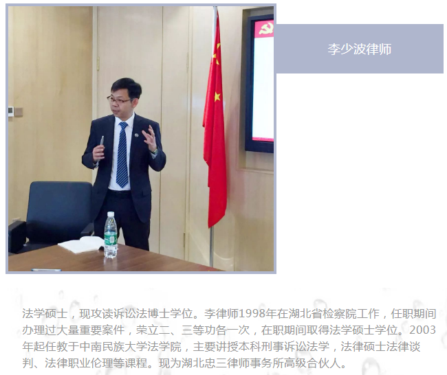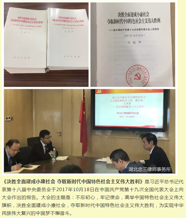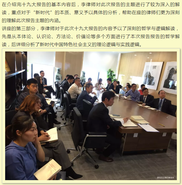 3月30日下午,“忠三法律大讲堂”第三期在我所会议室隆重开讲。忠三所高级合伙人李少波律师为全所律师带来了一场主题为“做习近平新时代中国特色社会主义新思想的学习者、践行者、引领者——党员律师解读十九大报告”的专题讲座,为各位党员、非党员律师详细介绍了十九大报告的主要内容,深刻解读了报告的内涵与思想。忠三所主任严道清律师、书记王文武律师等各位高级合伙人律师均到会一同聆听,并发表了自己的看法。