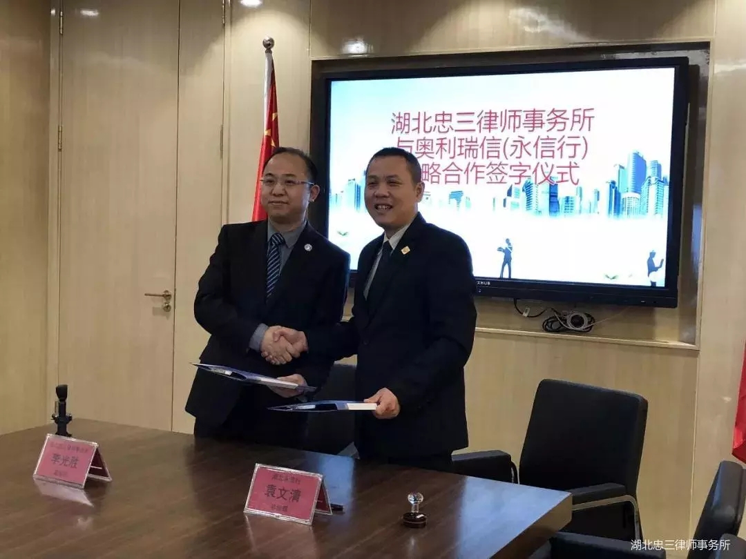 3月19日上午,湖北忠三律师事务所和湖北奥利瑞信管理咨询有限公司战略合作签约仪式在位于CFD时代财富中心的湖北忠三律师事务所会议室隆重举行。湖北忠三律师事务所副主任李光胜律师、湖北奥利瑞信管理咨询有限公司总经理袁文清分别代表双方机构签署了战略合作协议,双方机构主要负责人见证了签约仪式。