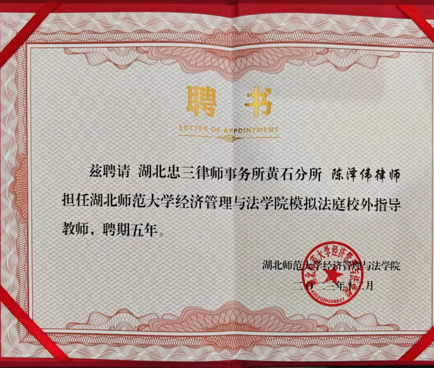 胡文森律师、陈泽伟律师利用休息时间,为此次模拟法庭活动认真筹划,精心指导,被聘为湖北师范大学经济管理与法学院模拟法庭校外指导教师。