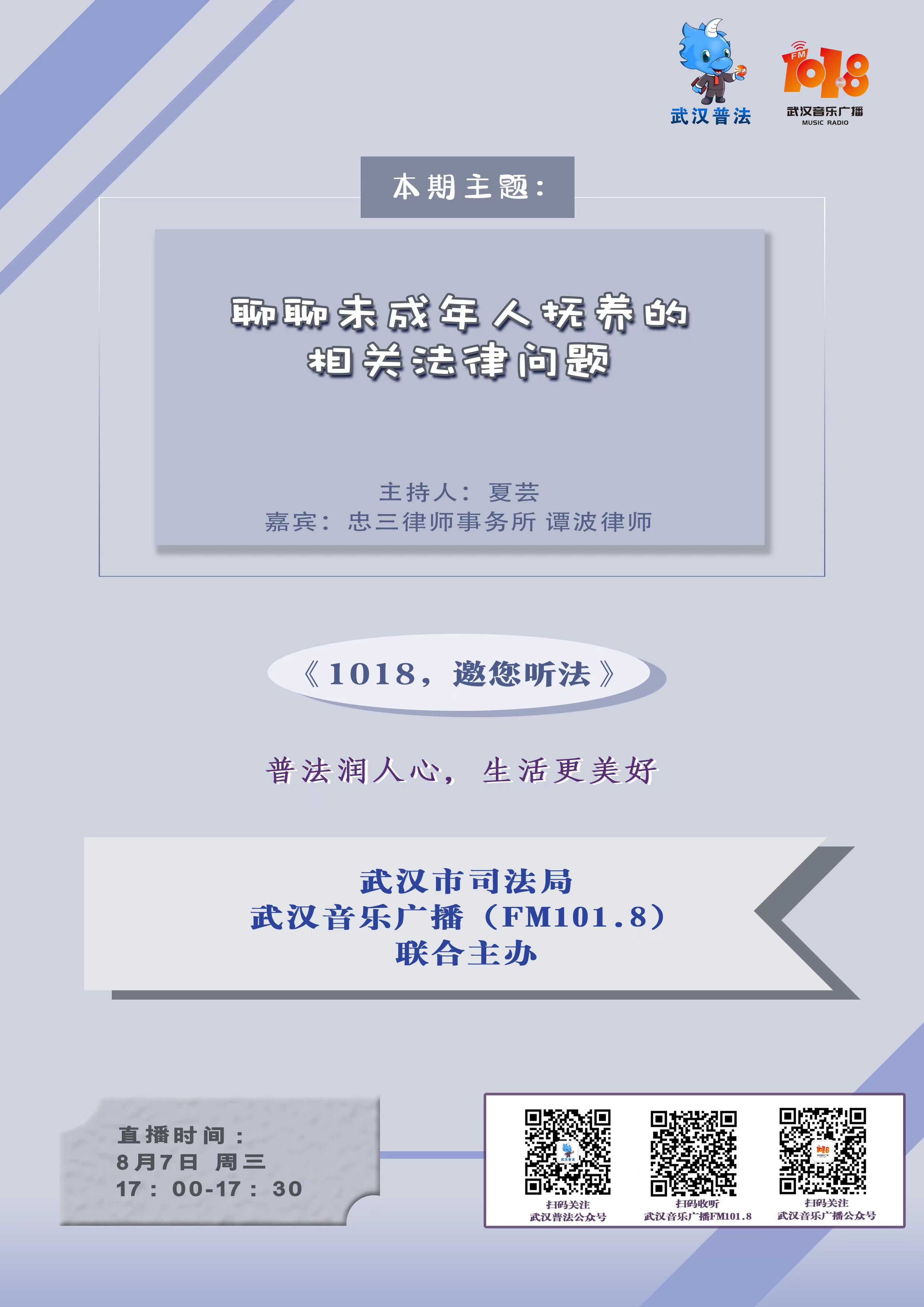8月7日,湖北忠三律师事务所(以下简称“忠三所”)的谭波律师作为忠三所“邀您听法”小分队的一员,参加了由武汉市司法局与武汉音乐广播(FM101.8)联合主办的《1018,邀您听法》栏目,跟大家分享的内容是未成年人抚养法律问题分析。节目中,他通过浅显易懂的方式解读相关法律规定,并结合具体案例阐述了实践中的难点和解决思路。