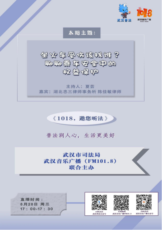 8月28日,湖北忠三律师事务所的陈佳敏律师作为“邀您听法”小分队的一员,参加了由武汉市司法局与武汉音乐广播(FM101.8)联合主办的《1018,邀您听法》栏目,跟大家分享了关于乘坐火车出行中旅客权益保护的有关法律知识。节目中,陈佳敏律师通过浅显易懂的方式解读相关法律规定,并结合具体案例阐述了实践中的难点和解决思路。