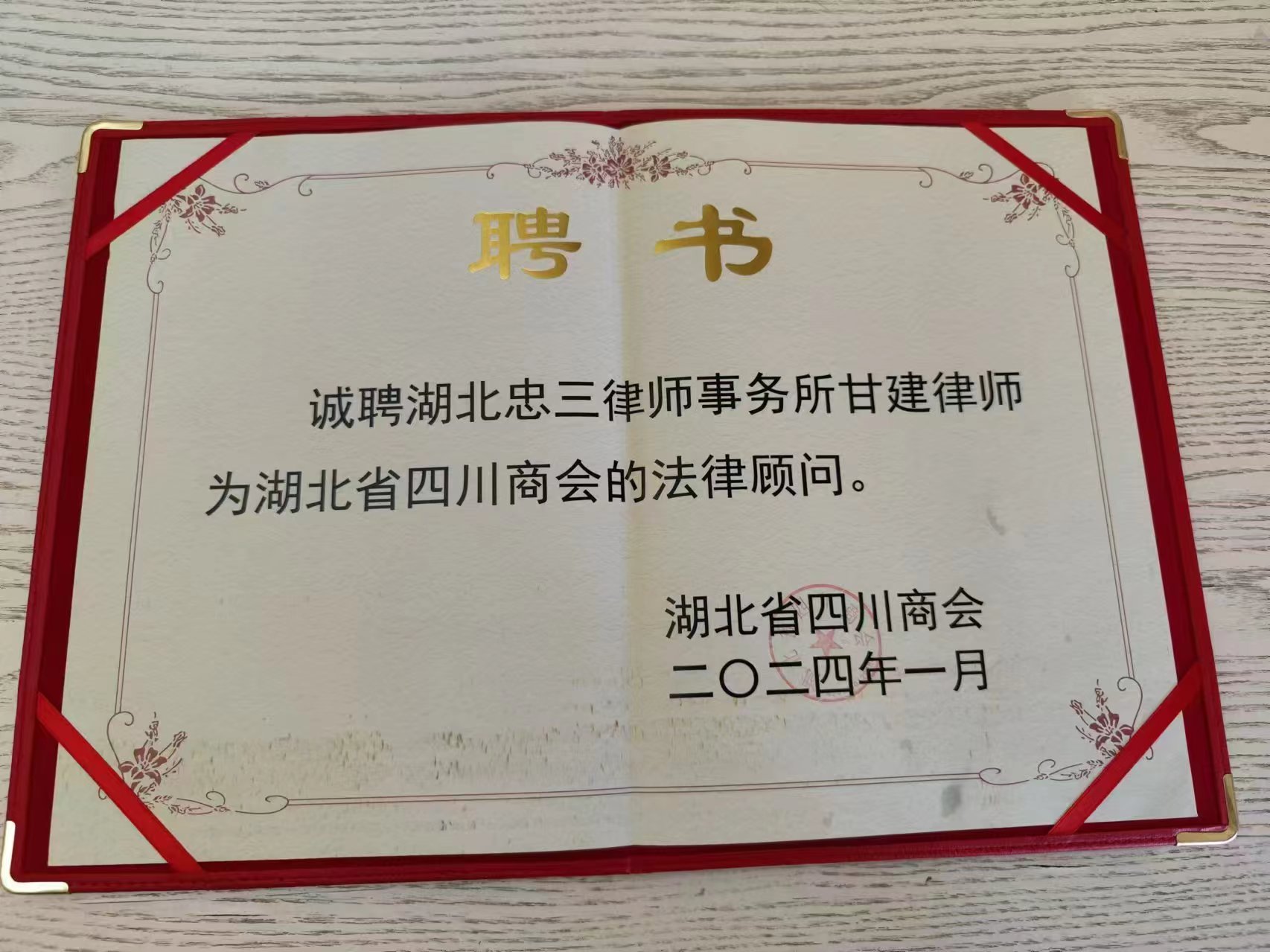 2024年6月27日,湖北省四川商会第五届第一次会员大会在武汉欧亚会展国际酒店隆重举行。在本次大会上,湖北忠三律师事务所甘建律师正式受聘为湖北省四川商会的法律顾问,具体负责湖北省四川商会的日常法律事务以及会员企业的法律咨询工作。